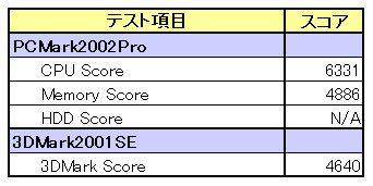 「PCMark2002Pro」と「3DMark2001SE」のペンチマークテスト結果