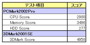 「PCMark2002Pro」と「3DMark2001SE」のペンチマークテスト結果