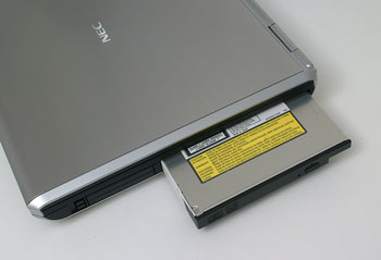 初期状態において、LaVie Mの光学ドライブは拡張ベイに装着されている。この拡張ベイは、着脱が可能なタイプだ。LaVie Mには、モバイル時の重量を軽減するための「拡張ベイカバー」が標準添付されているので、本体重量をより軽くして携帯することも可能である。