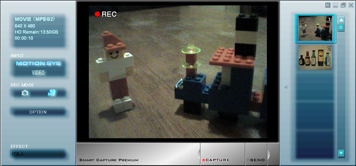 MOTION EYEそのものは以前から搭載されており、特に目新しいものではない。スローシャッター対応の35万画素プログレッシブ方式のMOTION EYEとキャプチャーソフト「Smart Capture Premium」により、静止画や動画をパソコンに取り込むことができる。