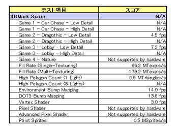 なお、3DMark2001SEは一部のテスト項目しか走らせることができなかったため、「3DMark Score」は算出されていない。とはいえ、「Low Detail」のゲームですら10fps以下なので、3D性能はほとんど期待できなさそうだ。