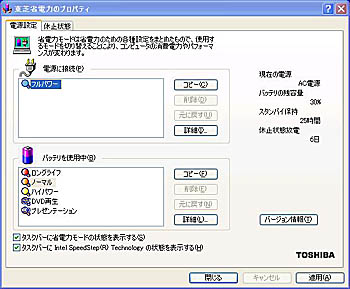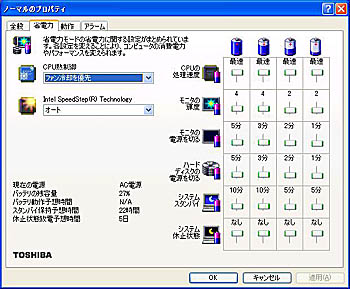 P-Review:これが東芝の旗艦ノートPCだ!−−GeForce FX Go5600とクリアパッド採用プレインストールOSは、Windows XP Professional(SP1)。アプリケーションソフトは、オフィススイートソフト「Microsoft Office XP Personal」、セキュリティ対策ソフト「Norton Internet Security 2003」、DVD再生ソフト「WinDVD 4」、DVD-R/RW用オーサリングソフト「DVDFunSTUDIO」、DVD-RAM用編集・記録ソフト「DVD-MovieAlbumSE」、デジタルビデオカメラ用映像編集ソフト「MotionDV STUDIO」などが付属する。 また、東芝オリジナルの省電力設定ユーティリティも当然備わっており、使用状況に応じて、CPUのパフォーマンスや冷却ファンの回転、バッテリ寿命を細かくコントロールできるのはとても便利だ。さらに、同社オリジナルのネットワークユーティリティ「ConfigFree」を新搭載したことで、登録済みのネットワーク環境に変わると自動で設定を切り替え接続できる。ハードディスクドライブのソフト占有量は、約7.22Gバイト。 東芝オリジナルの省電力設定ユーティリティソフト バッテリ寿命を細かくコントロールできる 東芝のフラッグシップモデルの名に恥じない、パワーユーザーも納得のパフォーマンス