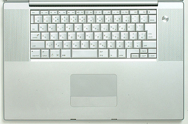 キーボードには、アンビエントライトセンサーを備えたバックライトが装着されている。周囲の明るさに応じてディスプレイの輝度を変えるだけでなく、キーボードのバックライトを点灯する。キーボードを上面から照らす方式だとできてしまう手の影がないので、暗い所でも快適に作業が行える。なお、PowerBook G4 12"と同様にキーボードユニットが本体に固定されたため、打鍵感が大幅に向上した。