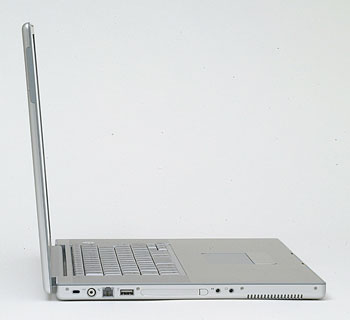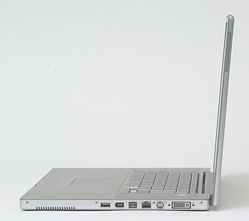 本体右側面。DVD、Sビデオ出力、Ethernet、FireWire 800(IEEE1394b)、FireWire(IEEE1394)、USB 1.1が並ぶ。FireWire 800は、変換アダプタを使えば既存のFirewire機器を接続可能だ(クリックすると拡大します)