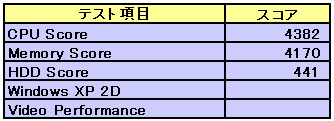 PCMark2002Proの結果は、「CPU Score」4,382、「Memory Score」4,170、「HDD Score」441という具合に、処理速度の基本となる3要素はいずれも良好な結果を残している。Video系もなかなかよい数値である。