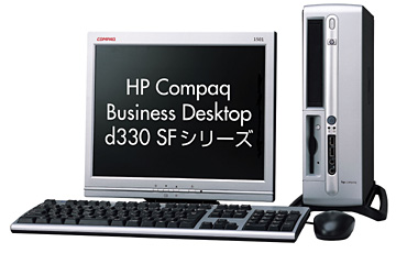 「d330 SFシリーズ」は、縦置き/横置き可能の省スペース型。インテルCeleron 2 GHz/400MHzを採用。インテル エクストリーム グラフィックス 2(チップセット内蔵)を搭載している。