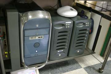 テラバイト単位の画像データをハンドリングするもっちーのオフィスでは、ご覧のRAID(レイド)が活躍する(Power Mac G4の隣の2台)