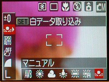 FUNCボタンを押すと被写体を見ながら操作できるメニューが現れる。左に項目が並び、下の段横一列に設定内容が表示される。迅速な設定には向かないが、アクセス性はよくわかりやすい。これはカスタムホワイトバランスを合わせるときの画面
