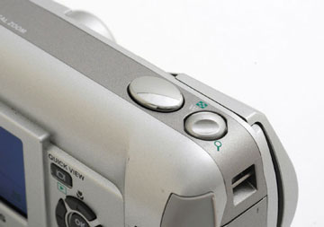 上面にはシャッターボタンとズームレバーがある。ズームレバーは、CAMEDIA C-900ZOOMから伝統のスイッチを倒すタイプ。この写真はレンズカバーを開けた状態で、開けると凹凸ができてグリップしやすくなる