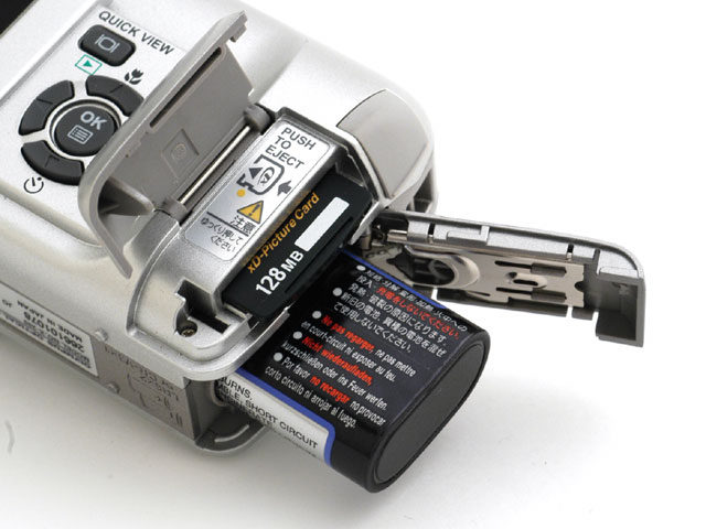 側面にはxDピクチャーカードのスロットとバッテリスロットがある。xDピクチャーカードの上にあるゴムのカバーはUSB端子。写真のバッテリはCR-V3リチウム電池パックだが、単3形電池2本でも動作可能だ
