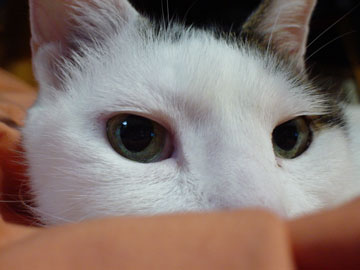 室内でマクロモードで猫の目を撮影。シャッタースピードはプログラムオート時の下限である1/30秒だが、ISO感度はオートにしていたのでISO320まで増感されている。だが、CCDが大きめなのとノイズがあまり目立たない被写体であることから、増感したとき特有のざらざらしたノイズは目立たない。なかなか優秀だ。ホワイトバランスも室内ながらきれいにあっている。絞り:F2.8、露出:1/30sec、露出プログラム:ノーマル(オリジナル画像はこちら)