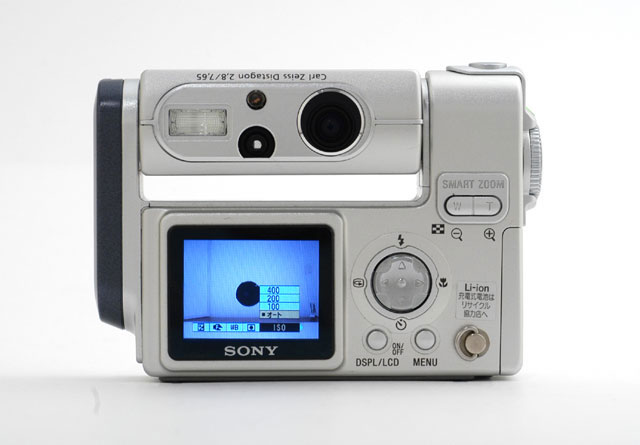 背面にはズームレバーがあるが、もちろんデジタルズーム用。ただし、普通の画像をデジタル的に拡大するデジタルズームではなく、ソニーがスマートズームと呼んでいる拡大処理を施さない方式を採用している。400万画素モードではズームは効かないが、200万画素モードだと400万画素の画像の中央部200万画素分まではズームするという方式だ。1600×1200ピクセルモードでは1.4倍まで、640×480ピクセルモードでは3.5倍までのズームが使える。