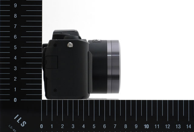 中央部にでんと構える大きなレンズが特徴。その上にポップアップ式のストロボが隠れている。幅がしっかりあるのでグリップしやすいのもよいし、高さがあまりないので工夫すれば持ち歩きも大変ではない