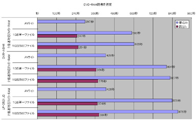![]() DVD-RAMメディアの読み書き時間の比較 書き込んだファイルは単一で1Gバイトのファイルと、デジカメで撮影した画像ファイル2500個で構成する計1Gバイトのファイル群。AVライトでの書き込みに利用したのも1GバイトのMPEG2ファイルだ。 ファイル書き込みでは、ベリファイの影響からか書き込み速度の違いほど3倍速メディアでも所要時間は短縮されていない。だが、それでも3倍速対応メディアでは確実に高速な書き込みが行われている。読み出しはおおむね3倍速と2倍速の違いが反映されており、AVライトもこれに近い。また同じ2倍速メディアを利用した場合にはLF-D521JDより、すべてにおいてわずかながら高速であった。