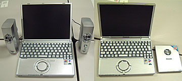 左がLet'snote W2、右がLet'snote T2とポータブルDVDドライブ。PC用スピーカーを含め、“円形デザイン”での統一性が図られている
