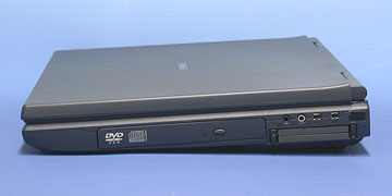 ![]() 右側面には、光学ドライブやPCカードType II×2またはType III×1(CardBus対応)、ヘッドフォン出力/光デジタルオーディオ出力、マイク入力、IEEE 1394×2、赤外線通信の各スロット/ポートが配置されている
