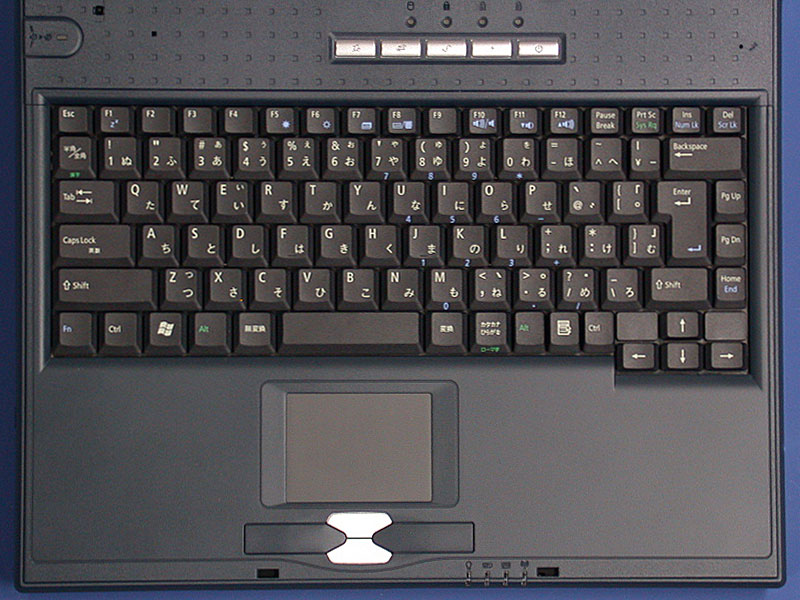 ![]() キーボードは、キーピッチ19ミリ、キーストローク3ミリのフルサイズ。キータッチはかなり重めだ メインメモリ増設用のSO-DIMMスロットは、かなり面倒な場所に配置されている。本体底面のパネルを外し、さらに冷却ファンユニットを外した奥にあるのだ。とはいえ作業自体は難しくはないので、丁寧に作業すれば問題はないだろう。 一方、HDDの着脱は簡単だ。本体底面のパネルを外し、マウンタを固定しているネジを抜けば、マウンタごと取り出すことができる。マウンタには9.5ミリ厚の2.5インチドライブを装着可能。ちなみに評価機は、日立製の流体軸受けタイプ「IC25N040ATMR04-0」を使用していた。 ベンチマーク結果から見たパフォーマンスについては、“スペックなり”といったところだ。評価機のCPUはモバイルPentium 4/2.20GHz-Mということもあり、なかなかの数値を示している。ハイエンドマシンにはもちろん及ばないものの、中堅クラスのノートPCとしては好スコアだ。一般的なアプリケーションソフトを動作させる分には問題ない性能を持っている。 Sandra