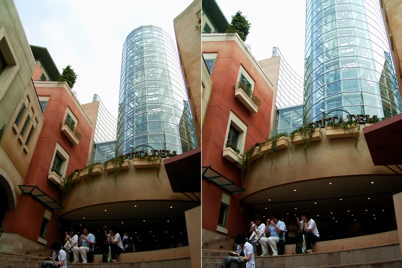 ![]() 28ミリ相当(左)ではバックにある透明な円柱状の建物がしっかりとフレーム内に収まっているが、35ミリ相当(右)では上部が切れてしまい、写真全体の開放感もイマイチ