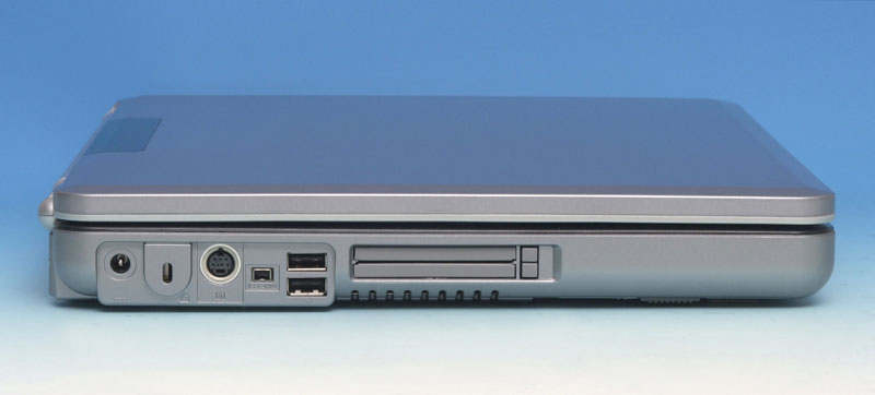 ![]() 左側面には、PCカードスロット×2、USB 2.0×2、IEEE 1394、ビデオ出力(S-Video)が配置されている