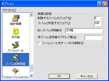![]() 画像2■スパム判定のしきい値設定。標準では50に設定されている。ほかにもアドレス帳登録アドレスを除外するなどの設定がある