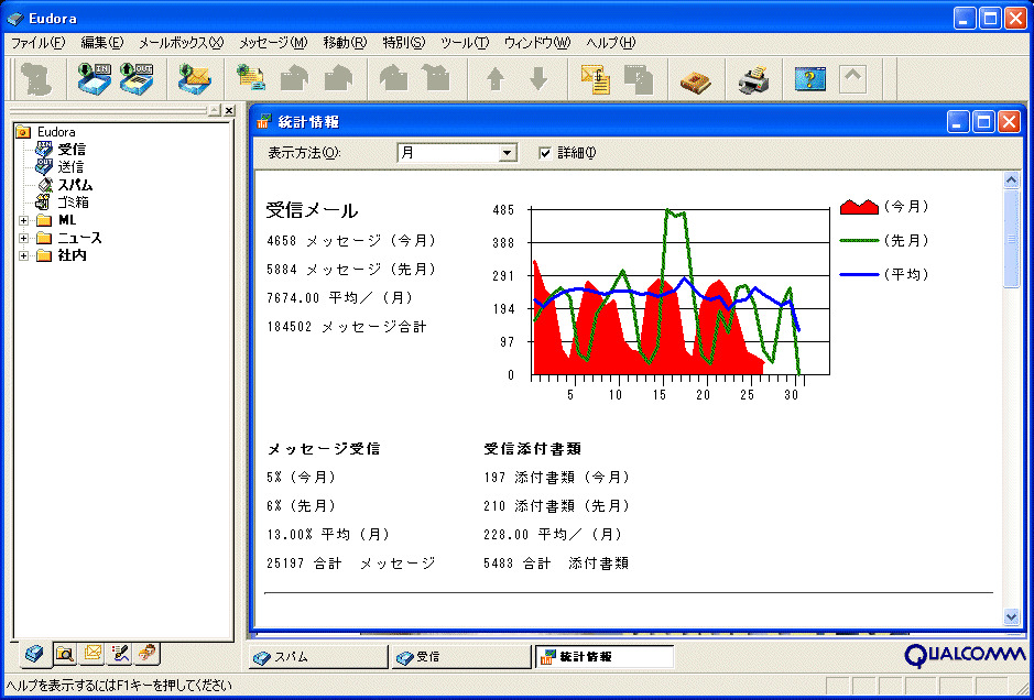 自動スパム排除がなかなかの認識率――優位性を見いだした「Eudora 6J for Windows」(2/3)自動スパム排除の認識率を完璧にするためには、各ユーザーが自分の環境に則したものへと育て上げる必要がある。Eudora 6Jでは、受信したメールに対し、「メッセージ」→「スパム認定」を実行することでスパム判定リストへ追加される。逆に「スパム解除」を選択すると、該当メールをスパム判定リストから除外することもできる。また、アドレス帳に登録しているアドレスは、スパム対象から除外することも可能だ。 筆者が前バージョン「Eudora 5.1-J」からのアップデートを行ったところ、スパムが一掃されたのにおどろいた。一般的には、通常通りの受信を行ったあとで、スパム判定されたメールには識別マークが付き、その判定が正しいかどうかを人の手で制御して学習させる、というのがスパム認識のアプローチだろう。 Eudora 6Jの場合は、初回起動時に「自動的にスパムメールをスパムメールボックスに入れますか?」というダイアログが表示され、「はい」を選択すると、該当するメールを基となるスパム判定機能で「スパム」フォルダへと移す手順となる。しかし、実際にはスパムではないものまで含まれてしまうため、手動で識別マークの解除を行っていく手間が必要だ。 今回の試用では、学習なしの初期起動時の認識率は60%程度だった。この数値だけを見ればかなり低いと思われるかもしれない。しかし、前述したスパム排除機能を搭載するソフトと比較すれば、かなり健闘していることが分かる。 いろいろなスパム検知機能をこれまで試してきたが、筆者の環境下では根こそぎスパム判定されてしまい、多少つらい思いをした。そして学習させているうちに日々の操作が面倒になってしまい、スパム排除機能そのものが面倒になってしまうのだ。この点からも、Eudora 6Jの自動排除は、機能を無効にしてしまいたくなるほどの気が起きないレベルだ。Outlook 2003はかなりの精度を見せてくれるが、価格差を考えればコストパフォーマンスの点でEudoraの優位さがあるかもしれない。 別のPCでMozilla Mailを数カ月使い続けている経験から、Eudora 6Jの場合も1カ月ほど学習をさせれば落ち着くと考えていた。しかし、予想に反しかなりよい結果を示してくれた。筆者の場合、特定アドレス宛のメールがほぼ99%の割合でスパムだったため、フィルタ設定により振り分けして数十通をまとめてスパム判定へ加え続けている。これが学習を早めたのだろう。 使用開始から4週間後の現在、80%近くの認識率でスパム排除できている。ちなみに筆者の受信メール数は、日に平均250通程度、その中で明らかにスパムだと判別できているものは50通程度だ。このような統計情報も画像4のように分かる。いままでは見て見ぬふりをしていたスパムがきれいに排除されるのは、とても気持ちがよい。