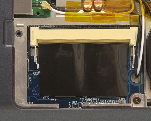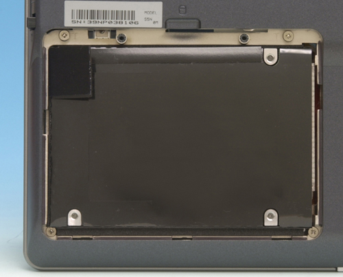 ![]() 本体背面のメモリースロット。メモリの空きスロットは1つ ハードディスクには日立GSTの「Travelstar 80GN IC25N040ATMR04」を搭載する。UltraATA/100接続の容量40Gバイト、回転数4200rpm、キャッシュの容量2Mバイトのスペックで、Cドライブにすべての容量が割り当てられていた。40Gバイトという容量でもなんとか利用できるが、同社のオンラインショップにて60Gバイト程度にカスタマイズすると、より利用範囲が広がるだろう。 ハードディスクへは、裏面のネジを2つはずすだけで簡単にアクセスできるので、ユーザー自身で簡単に交換できそうだ。