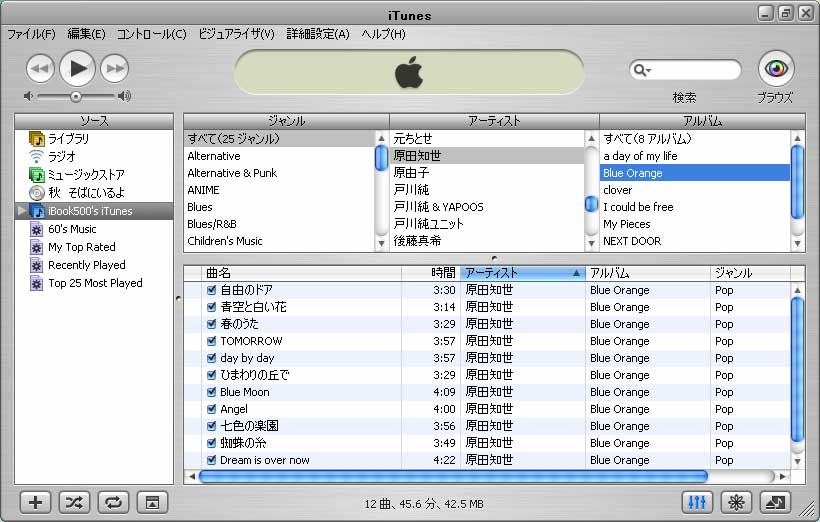 iTunes4は、ローカルネットワークにつながっている他のコンピュータで動いているiTunesのライブラリの曲を自由に再生できる(コピーはできない)。わたしが、Windows版iTunesを立ち上げて、一番びっくりしたのがこれだ。なんにも設定していないのに、iBookで動いているiTunesのライブラリが「入力源」に見えているのだ。