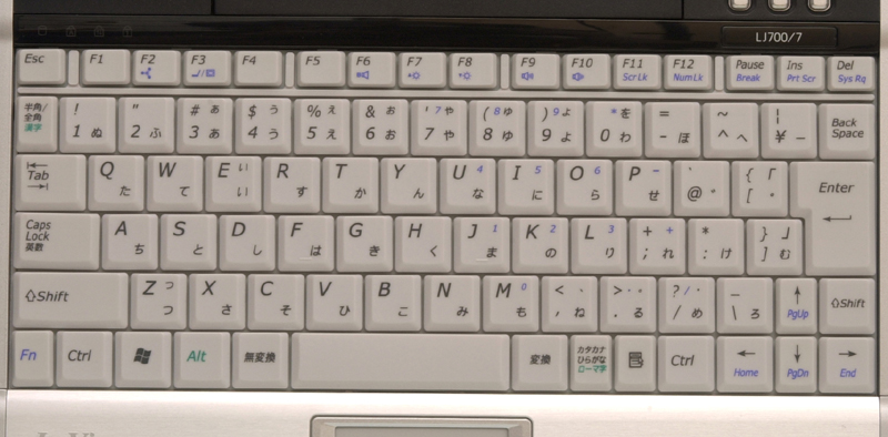 スペック面以外の仕様変更の中で特徴的な部分が、キーボードだ。従来モデルのキーボードでは、半角/全角キーが左Altキーの隣に配置されていたり、Enterキー付近のキーがやや小さくなっているなどの問題点があったが、LJ700/7Eのキーボードでは、半角/全角キーが1キーの左側、と本来の位置に配置され、さらにEnterキー周辺のキーサイズも他のアルファベットキーと同じサイズになっている。 また、数字キーの列とファンクションキーの列の間に隙間が設けられ、さらにファンクションキーも4つごとに隙間が設けられている。これはそれほど大きな変更には見えないかもしれないが、実際に使ってみると、数字キーとファンクションキーとの押し間違えが大幅に減るだけでなく、キーサイズがほぼ統一されたことで、タイピングも非常に軽快だ。
