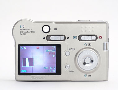 EXILIMの第一期完成形――カシオ EXILIM EX-S20(2/3)ほかにも撮影機能はけっこう高度なものを持っており、ISO感度は64から500まで4段階でマニュアルセット可能である。ISO500ではさすがに偽色ノイズが目立つが、高感度で撮れるかどうかは大きなポイントだ。露出補正は±2段まで1/3段ステップで変更できる。 それ以外にもカシオ得意のベストショット機能があり、人物、風景、風景と人物、カップリングショット、花、ペット、緑など、15種類のシーンが登録されている。彩度や色合いが目的のシーンに応じてコントロールされるため、各シーンのクセを理解すれば多彩な撮影が可能だ。 円形十字キーの上下と左右には、好きな機能を割り当てることができる。例えば左右を露出補正、上下を撮影モードにするなど、自由にセット可能だ。見た目がシンプルな割にカスタマイズの幅は広い。 液晶モニタは1.6インチTFT液晶で、けっこう明るく見栄えは良い。構図や水平・垂直を確認しながら撮影できるグリッド表示機能や、リアルタイムヒストグラム表示機能を備えている。