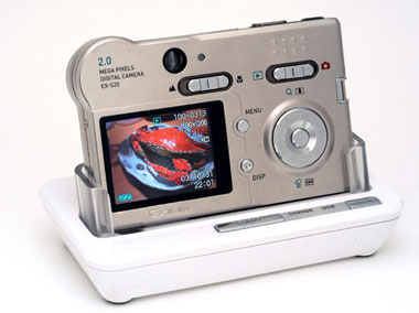 ![]() 底面にはSDメモリーカードスロットを配置する。カバーはなし。さすがにここまで小さいと三脚穴はない 画像をパソコンに転送したり、充電する時には付属のクレードルを使う。クレードルもデザインが一新され、モダンな真っ白の船っぽいデザインになった。 クレードルにセットすると充電が開始される。ここでクレードルの「PHOTO」ボタンを押すとカメラの液晶モニタでスライドショー再生が始まり(EX-S3が2インチだったのに対し、EX-S20は1.6インチなので少々小さめだが)、「USB」ボタンを押すとストレージクラスとしてパソコンにマウントされるので、そのまま画像の転送ができる。メンテナンス性も非常に高く、扱いやすいのだ。