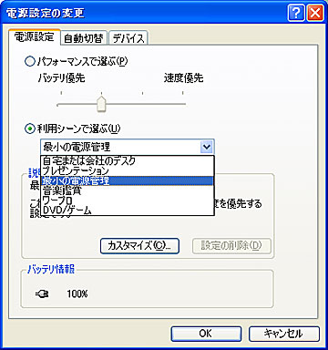 ![]() 各設定は、CPUの省電力、液晶ディスプレイの輝度調整などのカスタマイズが可能