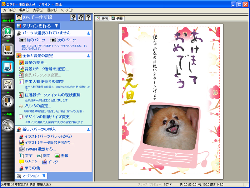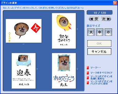 文面作成については、今回から新たに「無限デジカメデザイナー」という機能が追加され、デジカメ写真をベースに写真入り年賀状が簡単に作れるようになった。さっそくこれを使ってみたが、使用する写真を選び、どの部分を中心に使うかを指定すると、フレーム付きの文面デザインが約500通りほど自動生成される。手順としては確かに手早い。