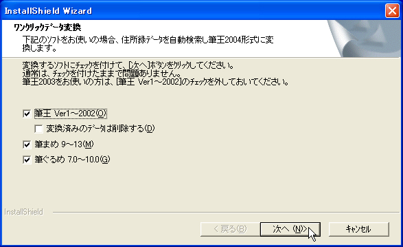 インストールの途中で、「筆まめ」などの他社製ソフトの住所録を自動的に検索し、「筆王2004」で使える形式にコンバートしてくれる