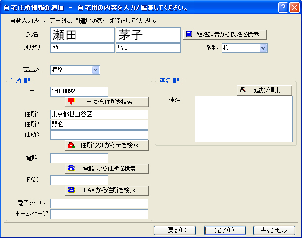 「筆王2004」では、先に住所録を作り、それから文面の作成という流れが基本だ。住所録の入力では「簡単カード追加ウィザード」が便利だが、初めに郵便番号もしくは電話番号から住所を特定し、あとから残りの情報(番地や氏名など)を入力するという独特の方式となる。しかしフォームは入力しやすい作りになっており、姓名辞書などが入力をアシストしてくれることもあって、スムーズに作業を終えられそうだ。