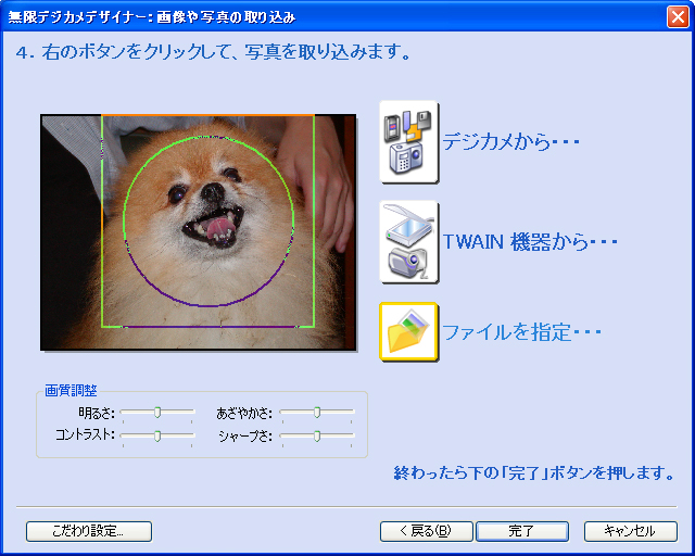 デジカメ写真を読み込み、どの部分を中心に据えるかを○と□の枠で指定する