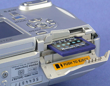 記録メディアは、従来コンパクトフラッシュ(CF)カードを採用してきたが、SDメモリーカード/マルチメディアカードに変更された。オプティオ33LF以外でも、最近のコンパクトデジタルカメラ(ハイエンドモデル以外)は、SDメモリーカードを採用するケースが増えている。これは、SDメモリーカードがCFカードよりも省スペース化と軽量化を見込めるからだろう。なお、デジタルカメラ市場の変化を受け、ノートPCに採用される記録メディアスロットも、CFカードからSDメモリーカードに切り替わったものが多い。