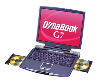 ![]() 光学ドライブにCD-R/RWとDVD-R/RW/RAMに対応したDVDマルチドライブを採用した個人向けオールインワンノートPC。CPUにはモバイルPentium 4-M-1.90GHzを搭載。最大解像度1400×1050ピクセルで表示可能な15インチTFT液晶ディスプレイとharman/kardonステレオスピーカーを装備する。マルチスタイルベイにはTVチューナを内蔵。 チップセットはIntel 845MPで、グラフィックアクセラレータには、32MBのDDRビデオメモリを備えたNVIDIA GeForce4 460 Goを搭載する。512MBのPC2100対応DDRメモリ、60GBのUltra ATA/100対応ハードディスクドライブ、フロッピーディスクドライブを標準装備する。インタフェースには、USB2.0、IEEE1394、PCカードスロット、SDメモリーカードスロットなどを用意。ネットワーク機能として、10BASE-T/100BASE-TX Ethernet、Bluetooth 1.1、IEEE802.11b準拠ワイヤレスLAN、56kbps対応モデムを搭載する。標準のリチウムイオンバッテリーで約3.5時間の駆動が可能。 オフィススイートソフト「Office XP Personal」をはじめ多彩なソフトを付属し、OSにはWindows XP Home Edition SP1をプレインストールする。価格はオープンプライスで、店頭予想価格は35万円前後。 このほか、IEEE802.11b準拠ワイヤレスLANとTVチューナを省き、標準メモリ容量を256MBに減らした廉価モデル「DynaBook G7/X19PDEW」(店頭予想価格は30万円前後)や、CPUにモバイルPentium 4-M-2.40GHzを搭載した「DynaBook G7/U24PDDW」もラインナップする。 スペック