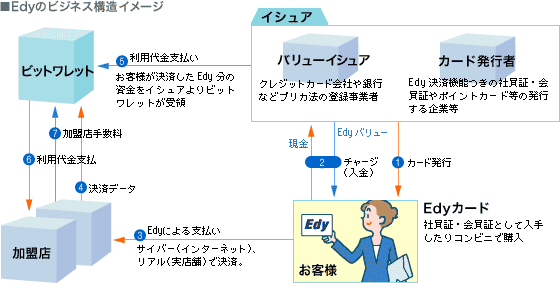 Edyのビジネスモデル。Edyは発行元(イシュア)をバリューイシュア(財務局に登録済みのEdyの電子マネー発行元。クレジットカード会社や銀行など)とカードイシュア(カード発行者)とに分離する「バリューイシュア」制をとっている。図はビットワレットのWebサイトより転載しかし、電子マネーが利用されるシーンは、コンビニや自動販売機など、単価が安いところが多い。一般に、コンビニが支払う手数料は、電子マネーで決済した金額の2〜3%と言われている。Edyが8月の1カ月間に利用された回数は約2500万件。発行件数やユーザー数が増えても、1回数百円の決済では、手数料収入は微々たるものだ。