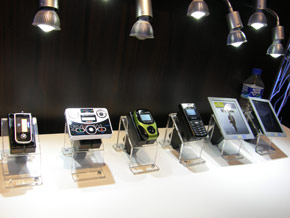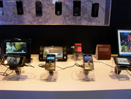 Mirasolが入った端末。左から4つまでは商用製品だ(写真=左)。現在画面サイズは5インチ程度までに対応。まずは電子書籍端末での採用を狙う。将来は、タッチパネルに対応させるなど技術を強化し、スマートフォンへの搭載を目指す