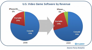 据え置き型を除いた携帯ゲームのみを見てみると、iPhone OSの占めるシェアは2008年の5%から翌年には19%に大きく拡大している。その一方でPSPは20%から11%へ、DSは75%から70%へとシェアが縮小している。