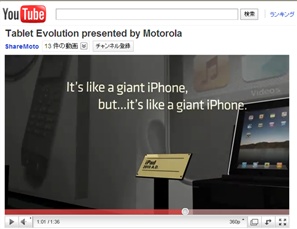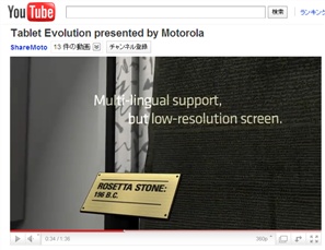 この動画は「Tablet Evolution presented by Motorola」というタイトルで、古代エジプトのヒエログリフが刻まれた石板から、iPadなど現代の最新デバイスに至る“タブレット”の歩みをユーモアを交えて描いている。ライバルであるAppleのiPadは「大きなiPhone」と皮肉を込めたコメントをつけ、SamsungのGalaxy Tabは「Android搭載だが、スマートフォン向けのAndroid」と指摘している。