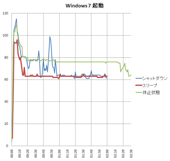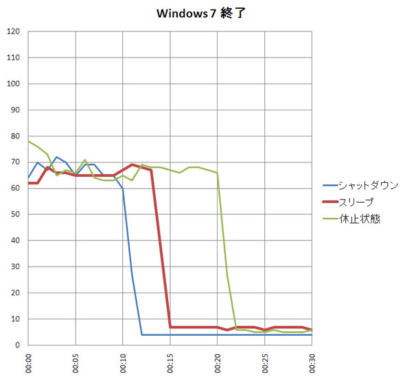 終了作業はXPのときと動作は異なっていて、シャットダウンがスリープよりも3秒ほど早く電力が下がっている。XPと比較するとスリープ、休止とも1ワット弱だが消費電力が増えている。大きな差ではないが少しだけ気になる結果となった。