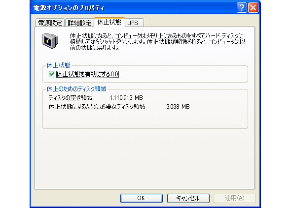 実際の設定方法だが、XPで休止を使用する場合は電源オプションのプロパティのタブで休止状態を有効にするにチェックを付け、コンピュータの電源を切るの画面でシフトキーを押すとスタンバイが休止状態に変更となる。