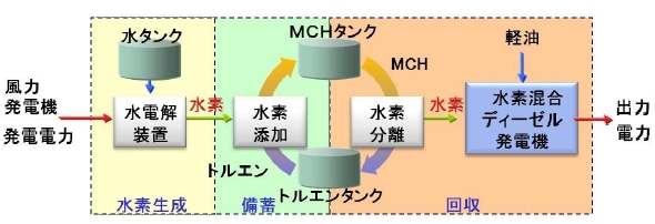 システムの全体像は以下の通り。まず、風力発電機で発電した電力を水分解装置に通じて水素を得る。「1時間当たり480Lの水素生成能力がある」(日立製作所)。その後、溶媒の一種であるC7H8(トルエン)に水素を添加して反応させ、MCHの形で備蓄する。電力が必要になったときには、MCHから水素を分離し、その後、水素を軽油と混合してディーゼル発電機を駆動するという仕組みだ(図2)。