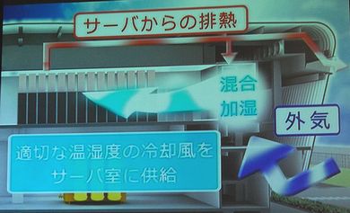 冷却は、まずチャンバールームという場所から外気を取り入れ、フィルターを通して浮遊物などを取り除く。きれいした外気はサーバの排気と混合して温度と湿度を一定水準にする。この空調機でこの空気をマシンルームの天井側もしくは壁側から吹きつけ、サーバを冷却。廃熱はサーバラック上部の排気管を通じて、一部は外気との混合に使用されるが、その他は建屋の上部から屋外に放出する。マシンルームを冷却する空気を天井側と壁側から送風しているのは、どちらの方法が冷却効率を高められるかを調べるためで、同社では最終的に効率の高い方を標準手法に採用するとしている。