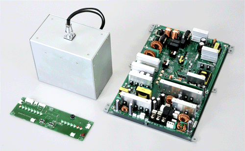 制御ユニットの特長は2つある。まず、家庭用コンセントから直接充電できる他、太陽電池モジュール*1)からの充電にも対応したことだ。次に電源モジュールは一般に発熱量が多く、製品化に当たってファン音を抑える取り組みが必要だ。シャープのモジュールではインバータ技術や高放熱技術を用いているため、ファンレス仕様のバックアップ電源を容易に設計できるという。
