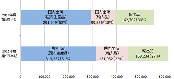 一方、総出荷量に対する構成比率を見ると、輸出品の比率が30%から27%に減少し、国内出荷分の国内生産品は52%から51%と微減した。比率が上がったのは国内出荷分の輸入品だ。18%から22%に上がっている。国内の需要が増加し、増加分のうちかなりの部分を輸入品が占めていることが分かる。
