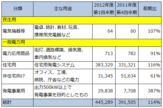 調査結果は出荷先と、国内における用途に分かれている。出荷先の調査結果を見ると、2012年第1四半期の総出荷量は61万3523kW。直前の四半期である2011年度第4四半期の総出荷量は55万4267kW。総出荷量は約10%伸びている。図1のグラフを見ると、国内出荷品、輸出品ともに数を伸ばしていることが分かる。