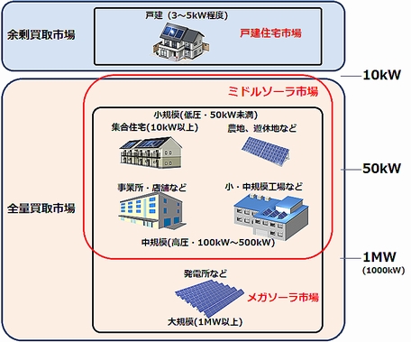 2012年7月に始まった固定価格買取制度では、太陽光発電は住宅用の出力10kW未満、非住宅用の10kW以上の2つに分類されている。さらに非住宅用のうち1000kW(1MW)以上の大規模なものは「メガソーラー」と呼ばれ、企業や自治体が遊休地を活用して続々と建設に乗り出している。