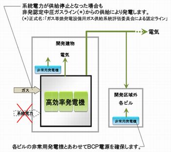 合わせて災害時の電力供給体制も構築する。電力会社からの系統電力が停止した場合でも、「非発認定中圧ガスライン」と呼ぶ非常用の発電機にガスを送り込むネットワークに接続して、ガスコージェネから電力を供給し続ける仕組みだ(図3)。このガスラインは東日本大震災の時にもガスの供給を継続できた実績があり、企業にとって重要なBCP(事業継続計画)の有効な対策になる。